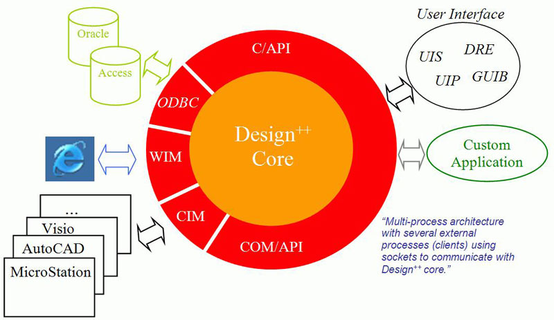 Unlike any other system on the AEC market, Design++ uses a model of the product to automatically coordinate all tasks and applications needed in automatically engineering it. The individual task may be to execute integrated "best-of-breed" solutions, legacy systems or captured expert rules. Like a "Traffic Cop" Design++ ensures that the tasks are performed in the right order both during first-pass design and during subsequent changes.