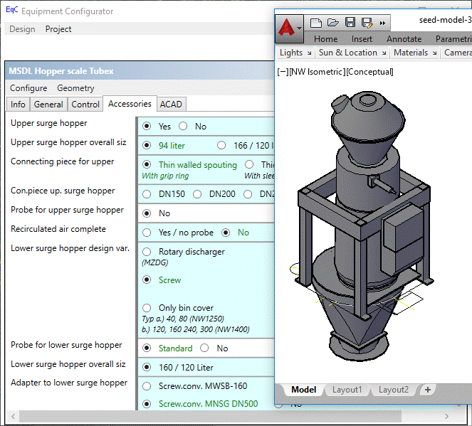 Bühler Equipment Configurator (EqC) is a multi-function software system that supports 3D design and configuration for machines and systems of machines as well as the gravity piping that connects machines, and even the buildings that will contain them. Design engineers quickly describe machines based on a combination of choices and numeric properties with constraints managed by EqC, and the results appear as 3D objects in an AutoCAD® drawing with other machines that have been previously specified for the project. For many machines, EqC can provide automatic ordering through Bühler's ERP system. For other specialized machines such as conveyors and elevators, EqC can create annotated and dimensioned drawings.