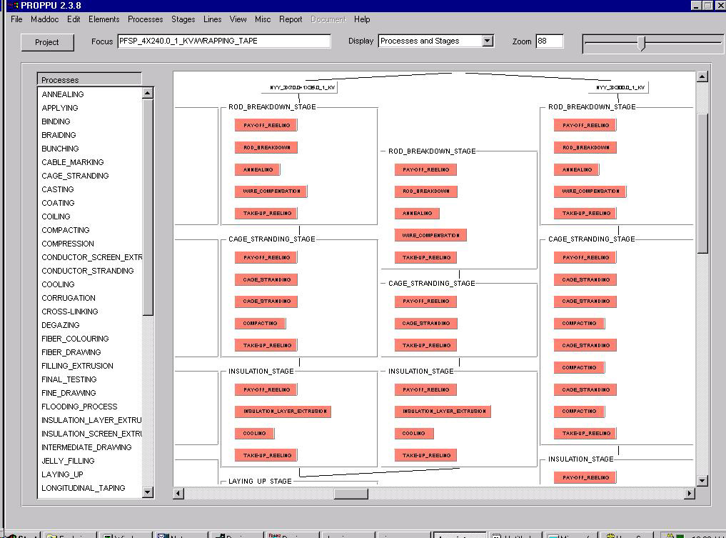 Using the Virtual Factory Configuration System the cable factory configuration is initiated by defining the cable production and product mix. Designers import cable structures form databases or define and store them for reuse as needed. Using captured knowledge the system configures processes and their stages. These are matched to production lines, machines and equipment stored in a database. Designers can modify stages and production lines by joining and splitting them. This critical feature allows highly optimized factory designs.